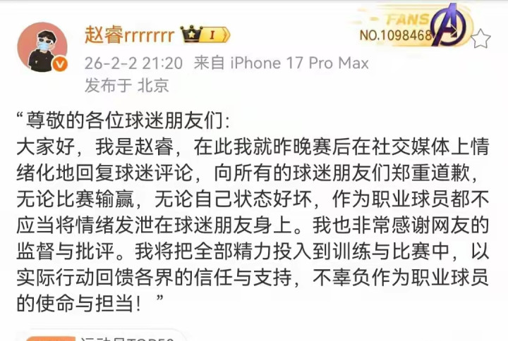 尤其是赵睿还特意回怼地址为新疆的球迷,部分言论更是直接超出了篮球范围,一时间引起了广泛的报道和热议。也正是这些话彻底惹了众怒,幸运8app而赵睿也在重压之下发布了道歉声明,直言自己过于情绪化,更不应该将这种情绪化发泄到球迷身上,感谢网友的监督和批评。未来将更多精力投入到训练和比赛中。