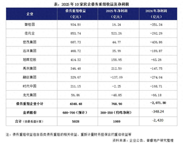 债务重组为企业镌汰有息欠债的同期,也为企业带来重组收益。2025年内有举座重组决策获批的9家企业,债务重组收益共计达到4348亿元,使得共计利润从2024年的亏空2071.8亿元变为盈利768.9亿元。其中境表里重组决策均获批的碧桂园,债务重组收益最高达934.8亿元;吉兆业则成为利润最高的房企,净利润高达523.26亿元。