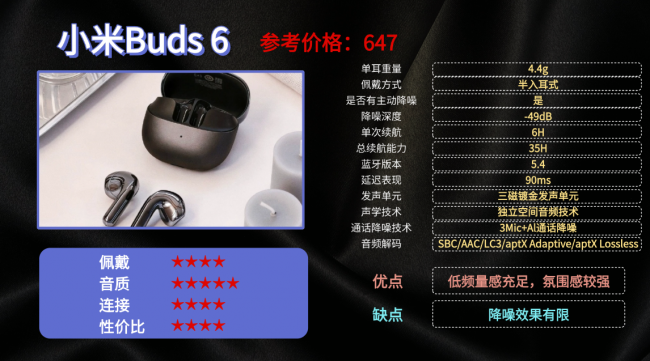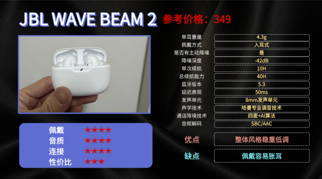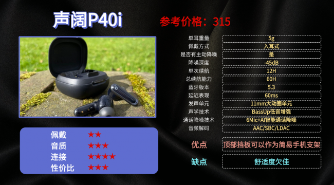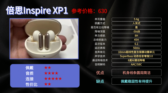 ✔音质推崇偏向耐听作风,8mm动圈单位提供充足低频和当然东谈主声,高频延展通透但细大要有保留,举座解析力适中,流行和民谣类曲目体验较佳。扶植蓝牙5.3,认知稳定性可以。续航方面,单次使用加充电仓可达约40小时,并扶植快充功能,10分钟充电可听3小时支配。永劫辰高音量使用时,高频部分细节稍显不及,但日常通勤和闲静听歌系数够用。