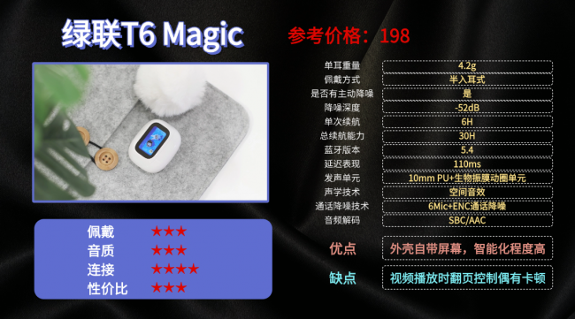 介怀:一定要选蓝牙5.4及以上+低蔓延芯片的!老款蓝牙5.2容易断连、音画不同步,打游戏看剧皆糟心;当今高端款用上专属低蔓延格式,游戏/影音双适配,音画同步、触控反应快,告别卡顿蔓延!
