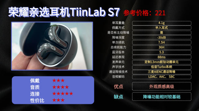 10、荣 耀亲 选耳机TiinLab S7蓝牙耳机