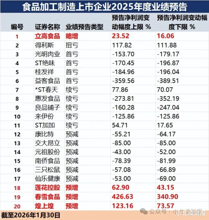 如下表所示,A股18家食物加工企业里事迹增长的唯有4家,其中立高股份略增,莲花控股、春雪股份和煌上煌预增;