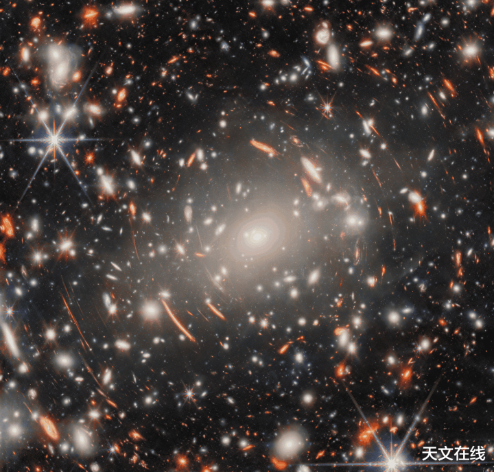 这张对巨型星系团阿贝尔S1063的超深场图像,是通过JWST在9种不同近红外波长下累计120小时的不雅测获取的。边幅代表相对波长,其中最红的天体杰出久了了被远景巨型星系团引力透镜效应放大的最远方布景星系。吞并布景星系在图像中屡次出现,这是引力透镜效应所致。