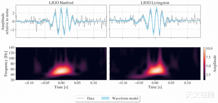 这张图展示了引力波GW231123的信号,该引力波被LIGO汉福德和LIGO利文斯顿探伤器同期不雅测到。底部频谱图中亮堂的边幅对应最强的信号振幅。开头:LIGOVirgoKAGRA合营组