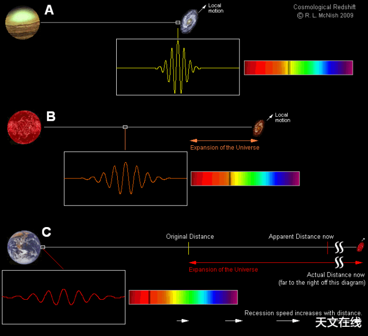 光或任何类波信号可能以特定波长辐射,但世界扩张会在其传播经过中拉伸它。对于其光来自相当远方星系的情况,紫外线辐射的光会一直红移到红外区域,引力波也会以十足交流的因子被拉伸。世界扩张加快得越快,来自远方天体的辐射红移就越大,这些信号看起来就越轻飘。