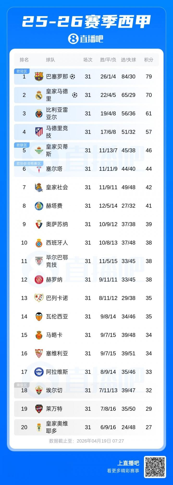 这将给巴萨一个契机:在国度德比中打败夙敌,从而锁定卫冕西甲冠军。那样的话,巴萨将在仅剩三轮联赛的情况下罕见皇马12分。虽然,澳洲幸运8app下载要是两队在接下来三轮中拿到疏导积分,不管具体成果若何,情况也依然如斯。