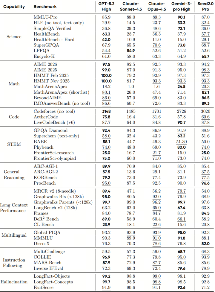 详细来看,Seed2.0 Pro在中枢语言才能上与GPT-5.2和Gemini-3-Pro同属第一梯队。长文本意会和中语场景意会是其皆备上风区,在数学推理、代码生成和通用知识上,与海外顶尖模子互有赢输,在部分重度依赖检索的任务上,仍有优化空间。