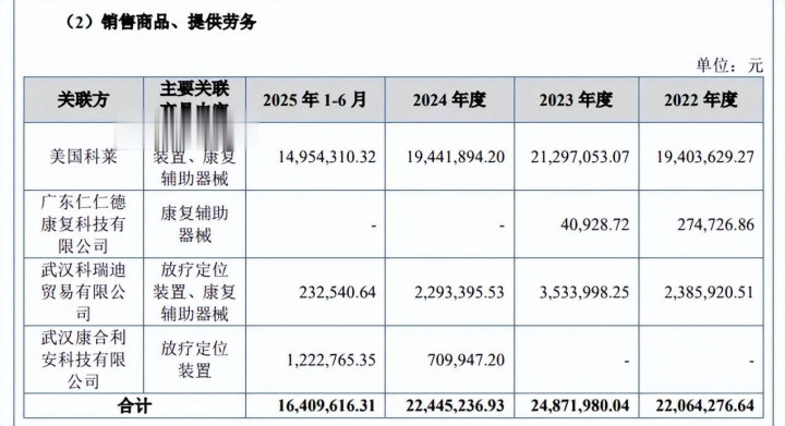 关联销售千万元级别,销售毛利率低于第三方。文书期内,科莱瑞迪关联销售金额保握在高位,米兰分手为2206.43万元、2487.2万元、2244.52万元、1640.96万元,其中对好意思国科莱的销售额分手为1940.36万元、2129.71万元、1944.19万元、1495.43万元;对武汉科瑞迪商业有限公司(科瑞迪)的销售额分手为238.59万元、353.4万元、229.34万元、23.25万元;2022年、2023年对广东仁仁德康复科技有限公司(仁仁德)的销售额分手为27.47万元、4.09万元;2024年、2025年1-6月对武汉康合利安科技有限公司(康合利安)的销售额分手为70.99万元、122.28万元。