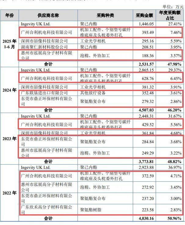 2022年至2025年1-6月,公司向广州合利机电科技有限公司(合利机电)采购机加工配件、个别型号碳纤维底座及头枕委外打孔,金额分手为372.59万元、429.52万元、628.76万元、393.49万元。