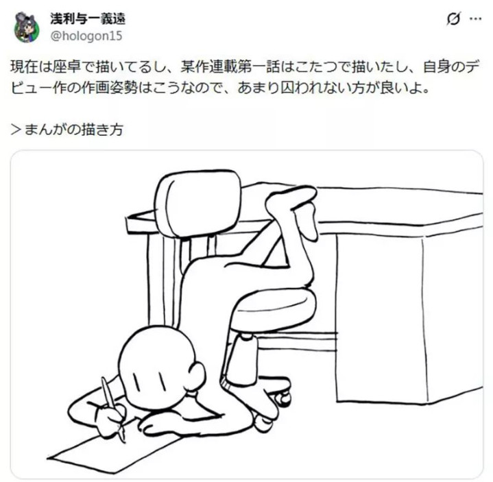《恶魔管家》的作家浅利义远默示,他出谈作则是用下图这种姿势画的。