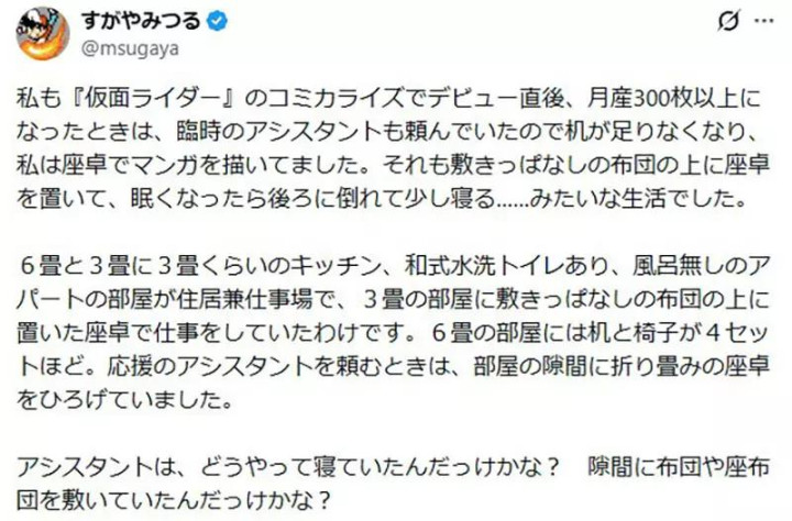 像《漫画谈》时间的漫画家,包括藤子不二雄这一代东谈主,大量齐是盘腿坐在矮桌前画稿。