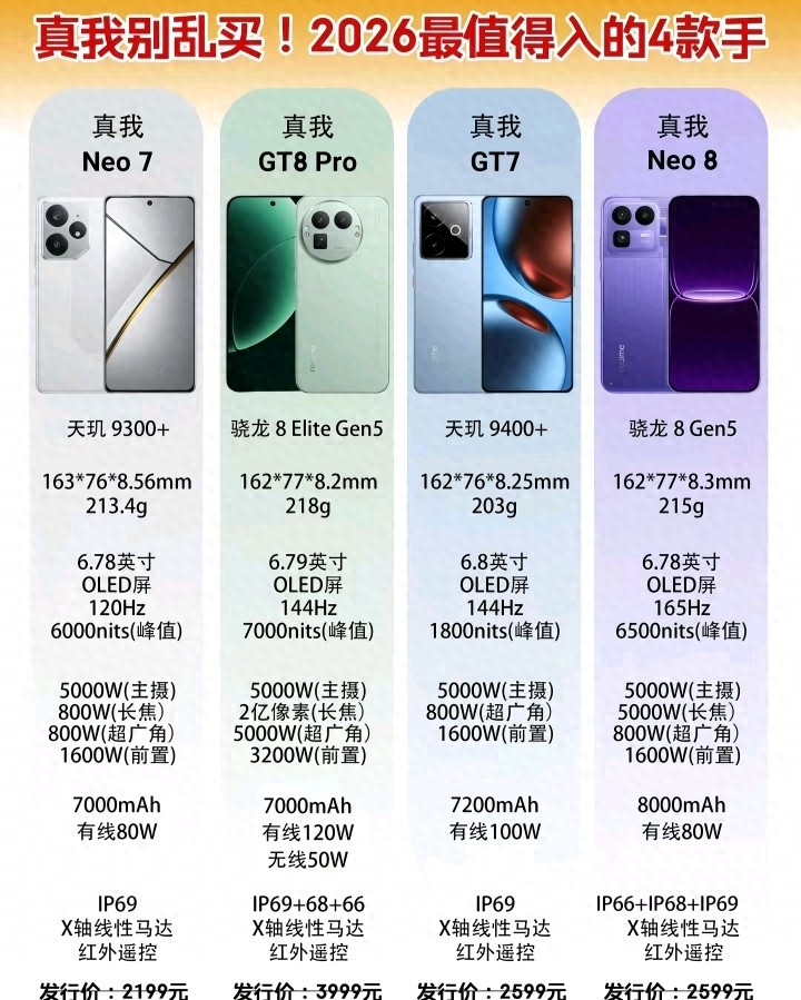 2026年已历程去了快要一半,手机市集的竞争依然止境浓烈,真我品牌在这个时分段推出了多款性能刚劲且价钱合理的产物,历程仔细筛选和对比,有四款手机格外值得耗尽者柔软,它们鉴识是真我Neo7,真我GT8 Pro,真我GT7以及真我Neo8,这些手机在惩处器,屏幕,电板,充电和影像等方面都有着出色的弘扬,好像倨傲不同用户的需求,底下将鉴识为寰宇详备先容这四款手机的成就特色和购买暴虐。