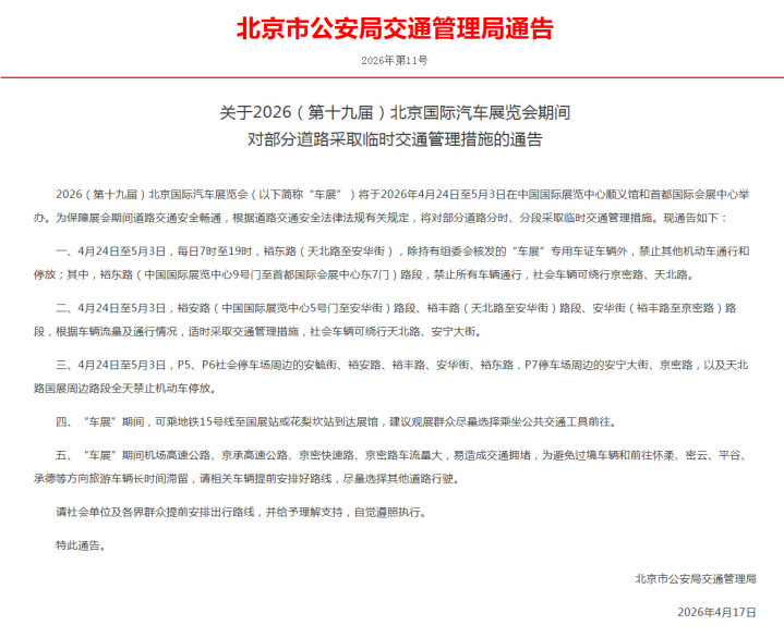 新京报讯据北京市公安局交通解决局音信,2026(第十九届)北京外洋汽车博览会(以下简称“车展”)将于2026年4月24日至5月3日在中国外洋展览中心顺义馆和齐门外洋会展中心举办。为保险展会时刻说念路交通安全流通,凭神话念路交通安全法律规章揣度司法,将对部分说念路分时、分段聘用临时交通解决花样。现文书如下: