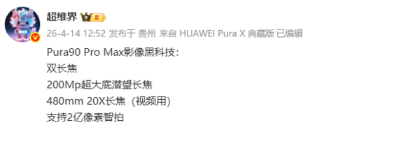 [CNMO科技音信]4月14日,数码博主“超维界”爆料称,华为Pura90ProMax将搭载双长焦影像系统。阔别为2亿像素的超大底潜望式长焦镜头与一颗成心用于视频拍摄的480mm等效焦距长焦镜头。