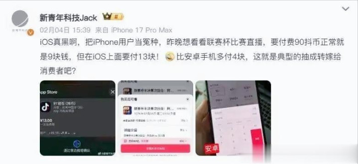 有网友算了一笔账:在安卓手机上购买直播平台的抖币,1元不错购买10个以至更多(视渠谈而定);而在iPhone上,1元每每只可购买7个,随机需要支付更高的溢价。文中提到的案例更是直不雅——相同看联赛直播,安卓用户支付90抖币等值金额,iPhone用户却需要支付13元(130抖币的量级)。