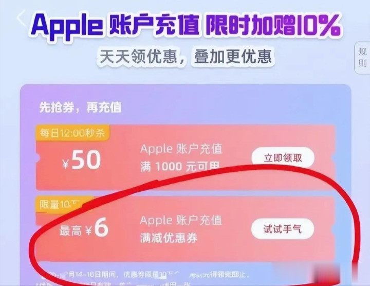 除了径直的10%返利,苹果还“附赠”了优惠券玩法。充值1000元,运谈好的话还能重迭50元优惠券,最高得手1150元。这种盲盒式的奖励机制,无疑加多了行为的真谛性和传播度。